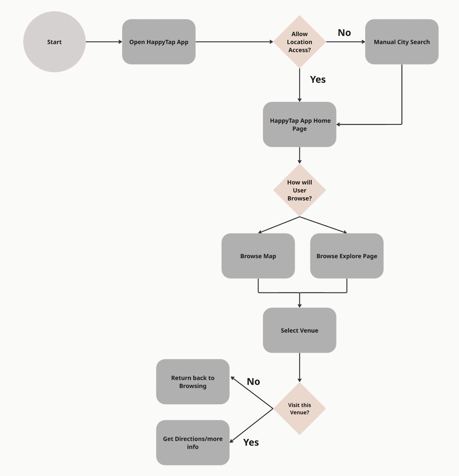 The goal of HappyTap is to create a centralized platform that allows users to easily discover nearby happy hour deals and make faster decisions about where to go. The app focuses on simplifying the discovery process through a location-based map that highlights nearby venues and provides clear information about drink specials and happy hour times. By incorporating user ratings and short posts, the platform also helps users better understand the atmosphere and quality of a venue before visiting. Overall, the design aims to make it easier for users to explore nearby options and plan social outings more efficiently.