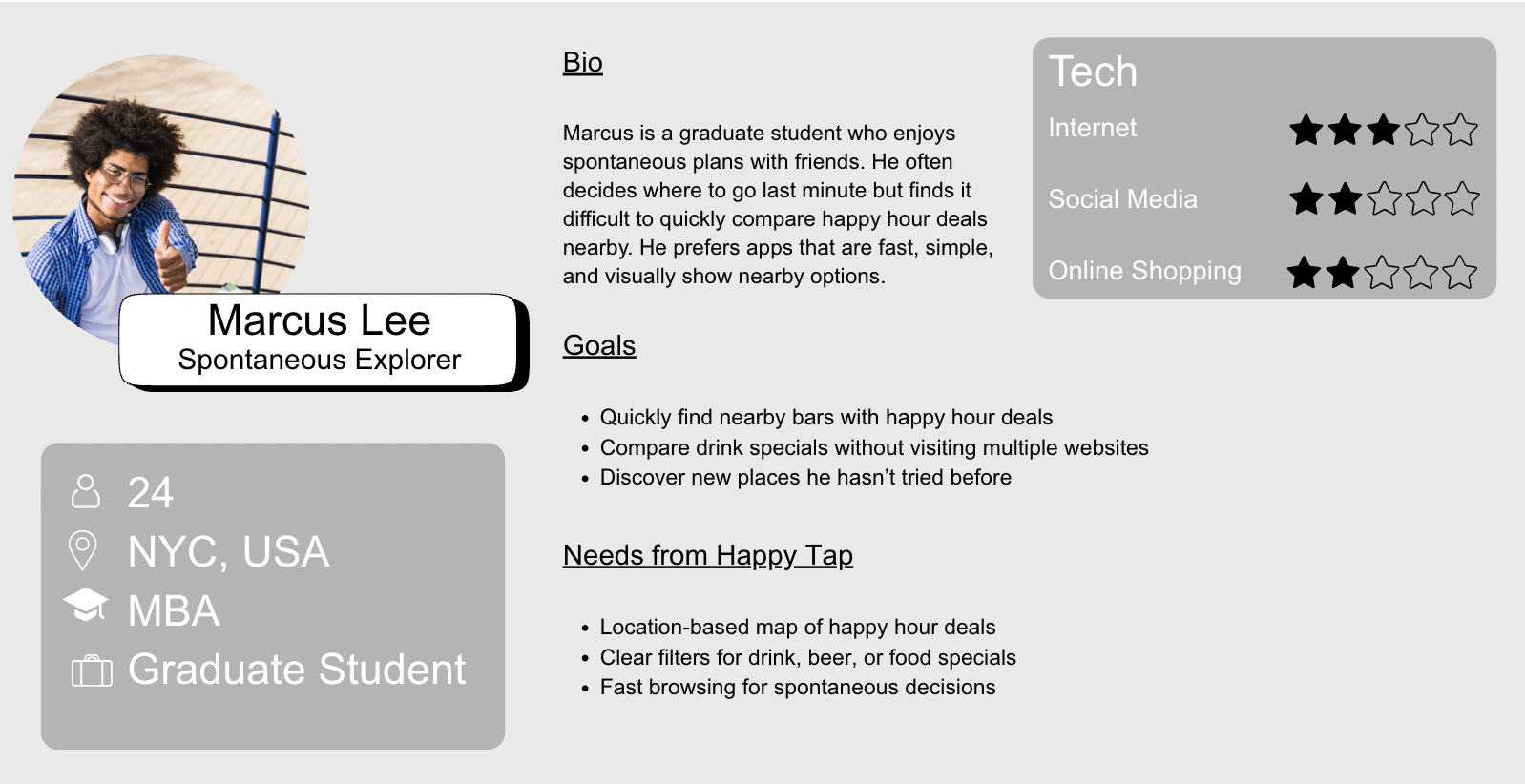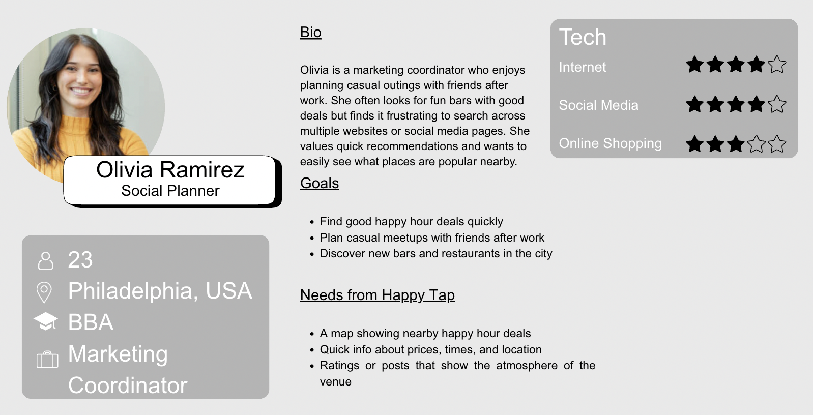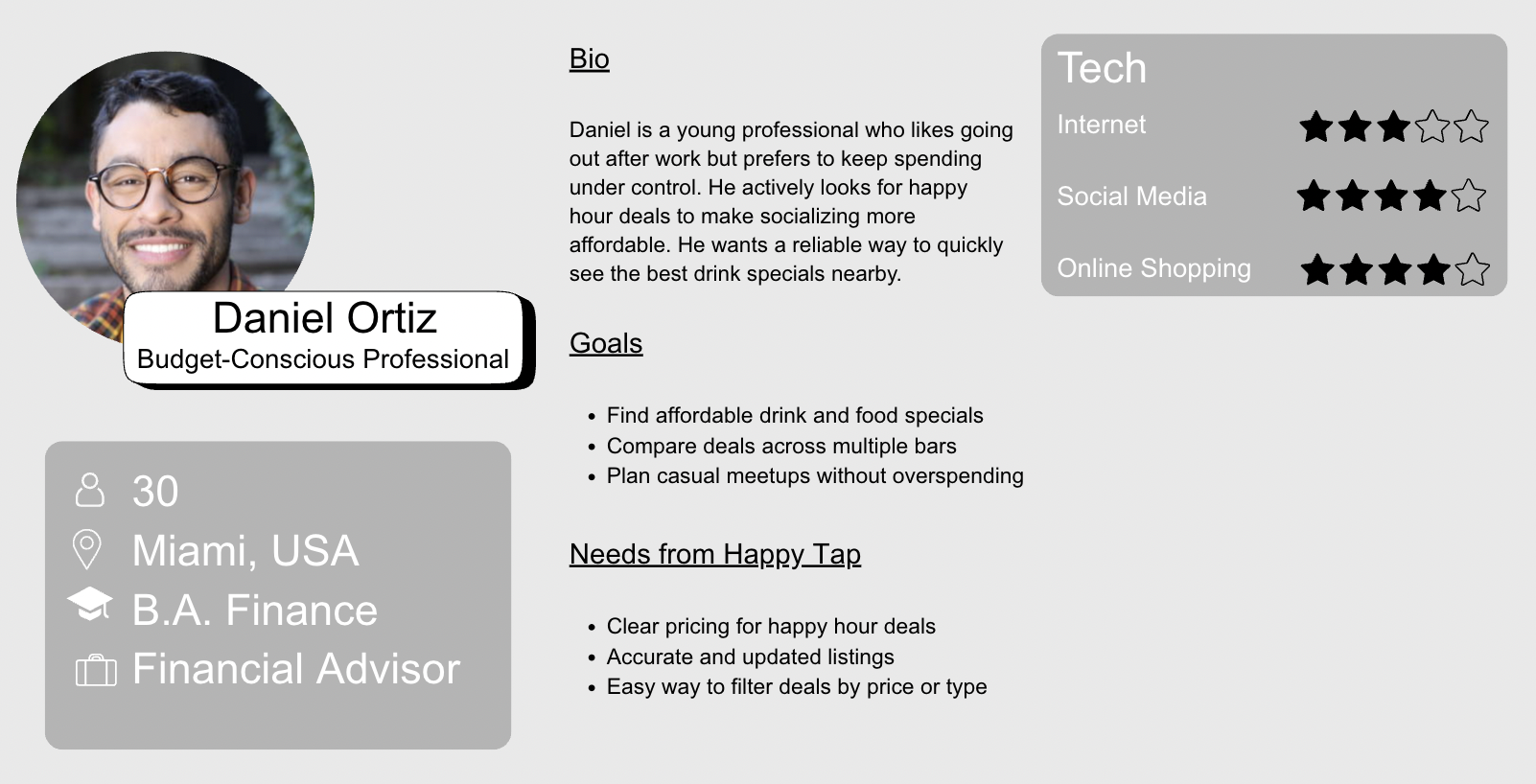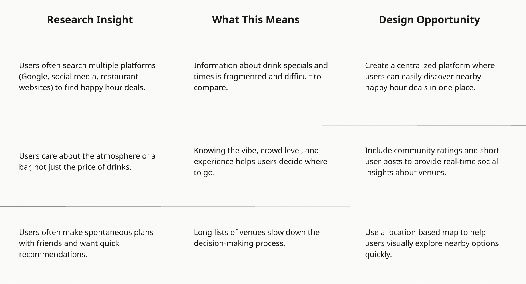 Many young professionals and students want to take advantage of happy hour deals but struggle to quickly find accurate and convenient information about nearby options. Details about drink specials, pricing, and happy hour times are often scattered across multiple sources such as Google, social media, or individual restaurant websites. Because this information is fragmented, users must spend time searching multiple platforms before deciding where to go. Without a centralized platform that shows both deals and real user experiences in one place, planning a spontaneous night out can become time-consuming and frustrating.