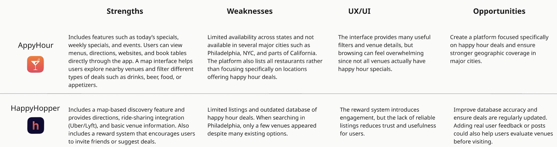 To better understand how users currently discover happy hour deals, I conducted a short survey to gather insights into user behaviors and preferences when planning social outings. I also reviewed existing happy hour platforms to compare how they present deals and venue information, helping identify patterns and opportunities to improve the discovery experience for HappyTap.